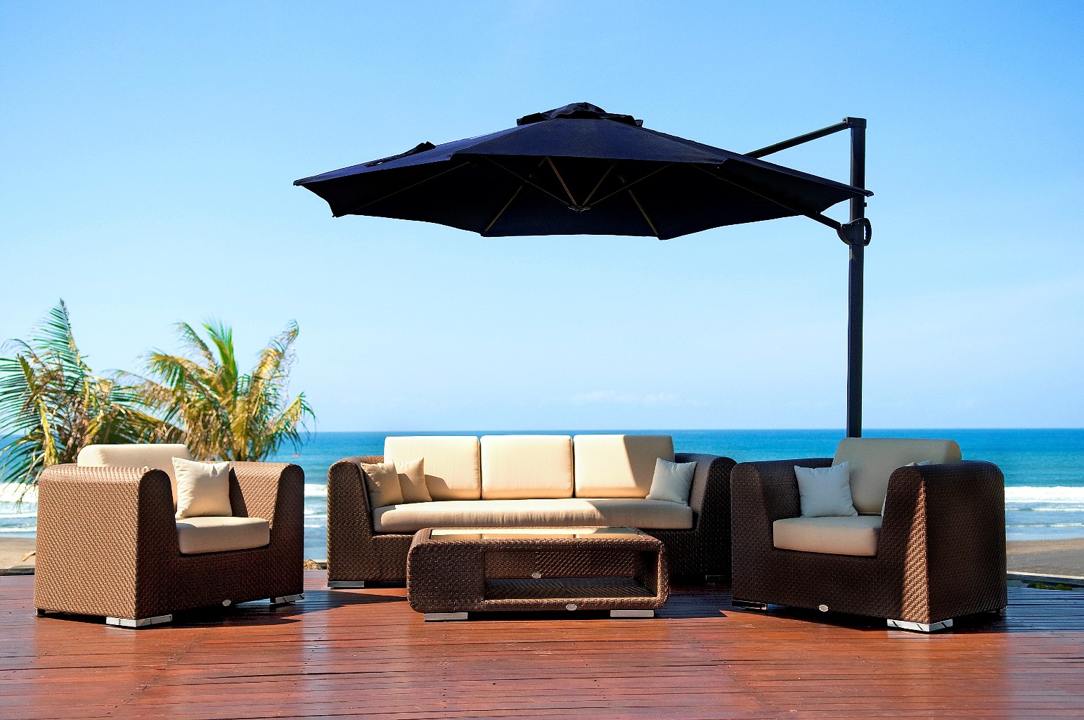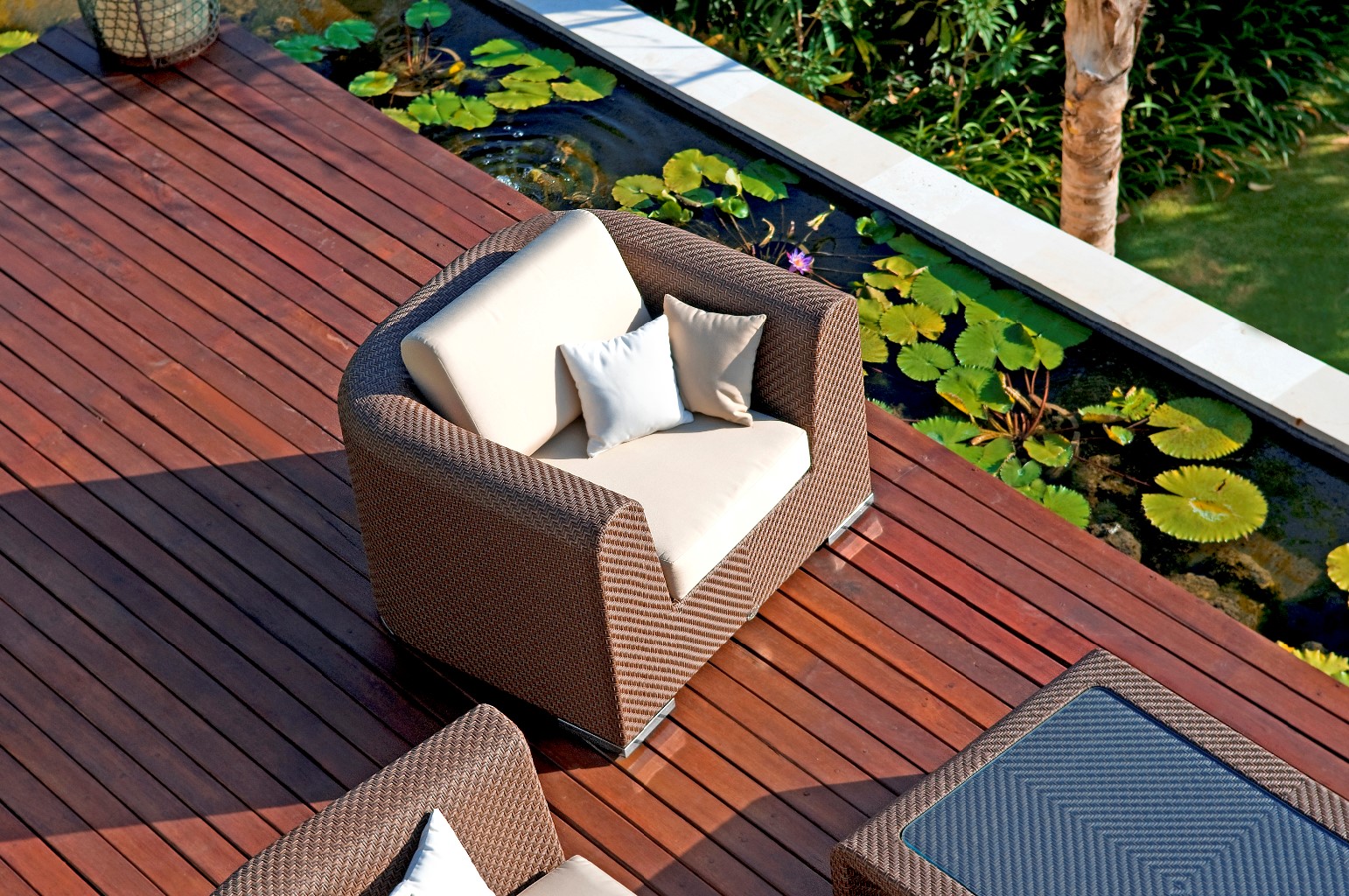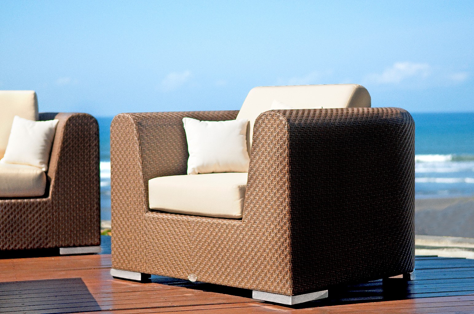 The revolutionary Breeze lounge arrangement combines outstanding craftsmanship with unusual design. Its elaborate herringbone weave pattern across the rounded armrests is both beautiful and timeless, not to mention resilient in all weather conditions.