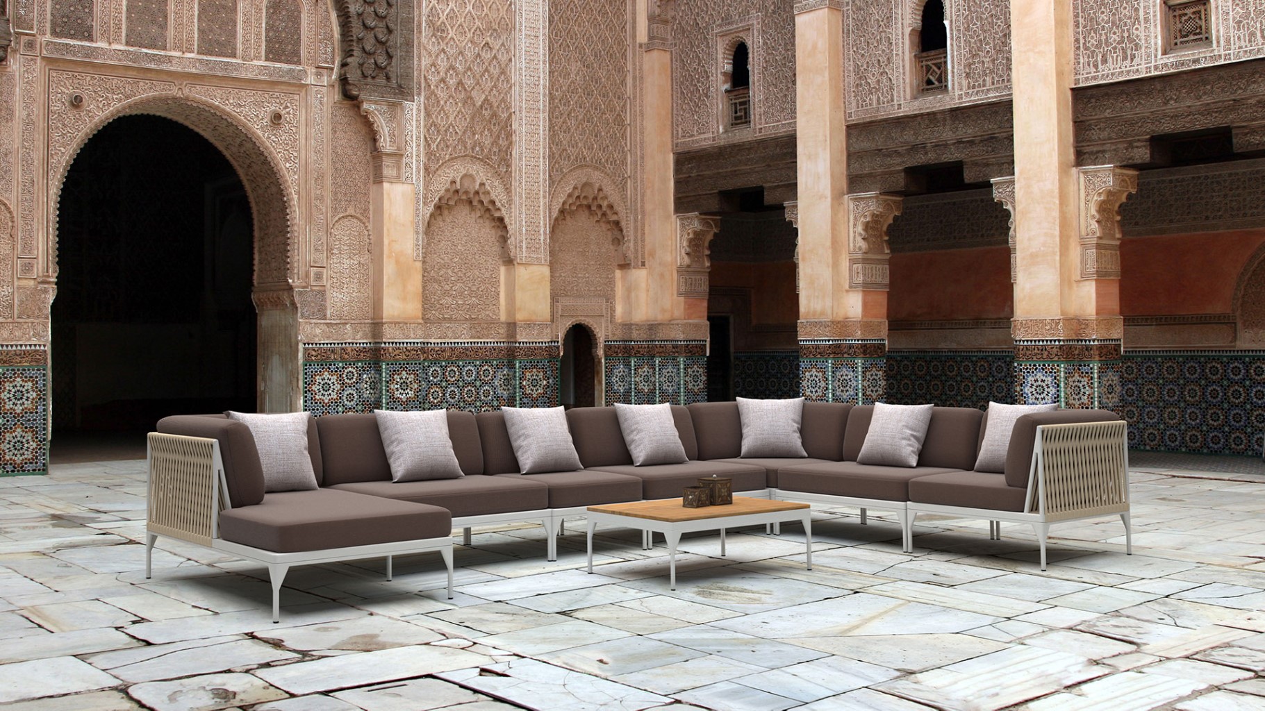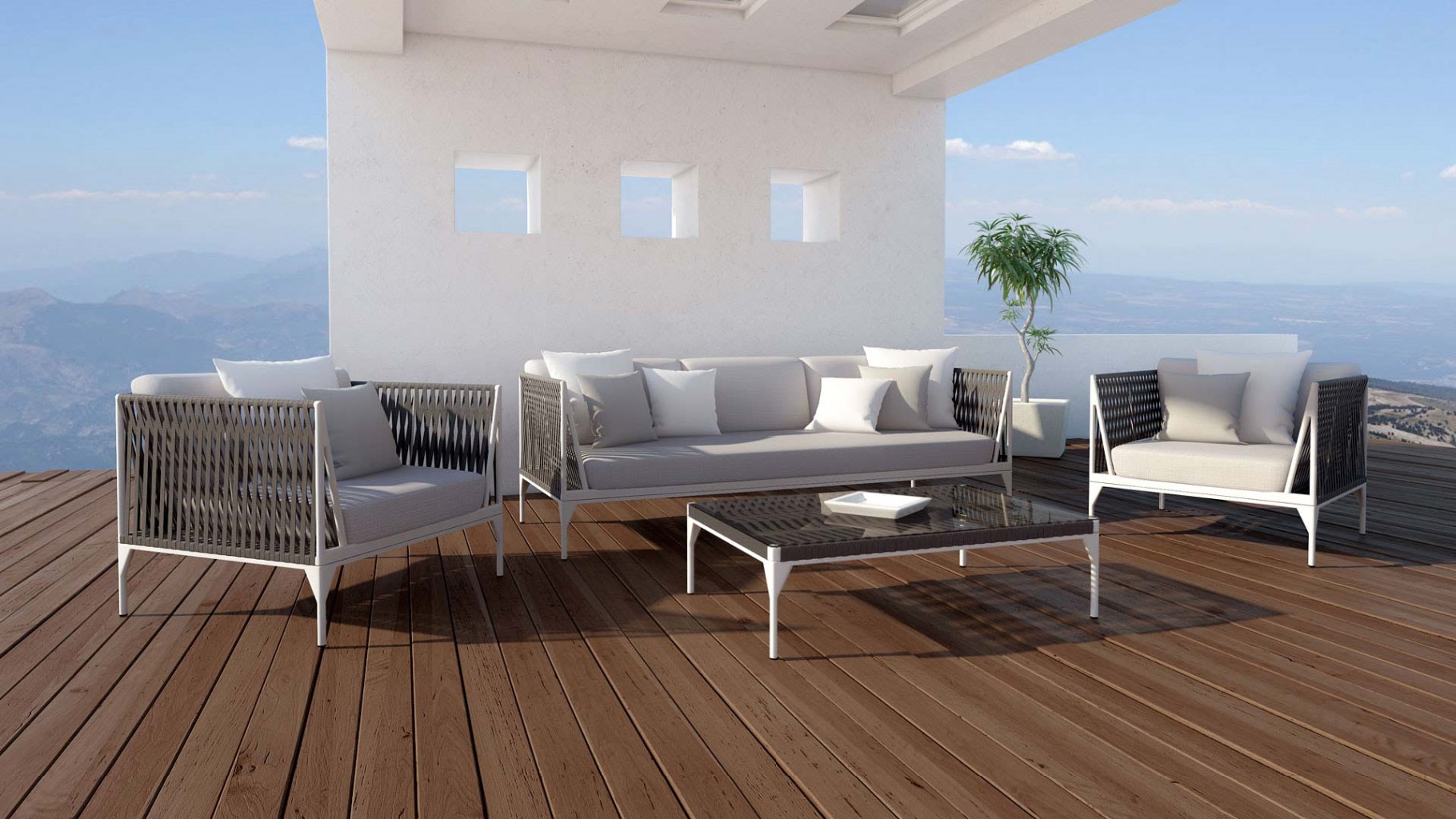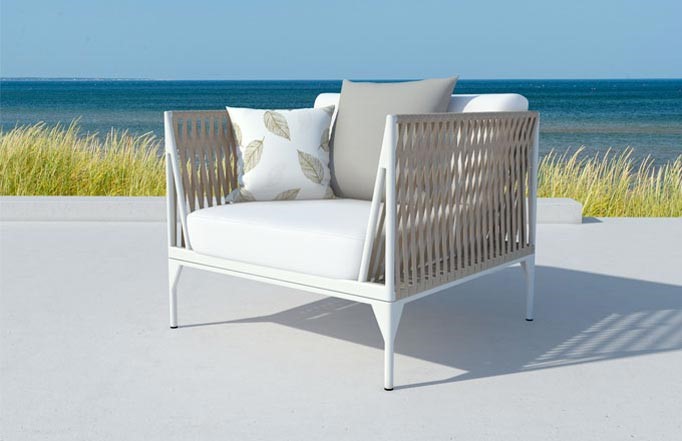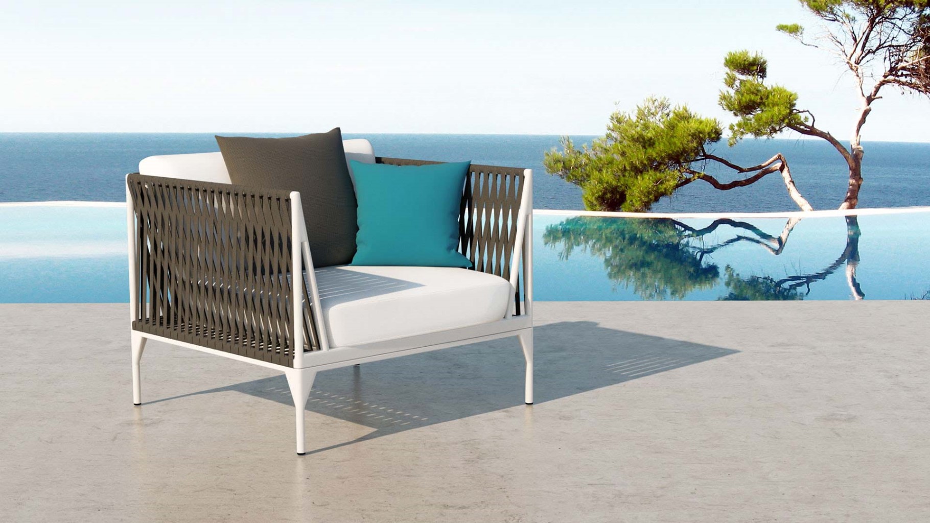 Elegance and strenght intertwined. LOOP with its airy wickerwork, it naturally expresses clarity and energy. Stability is obvious in the high quality of the workmanship alone but combined with a powder-coated aluminum webbed frame made of robust olefin material, it defies the sun, wind and water for many years. The covering is available in three natural shades whilst there are five colours to choose from for the frame.